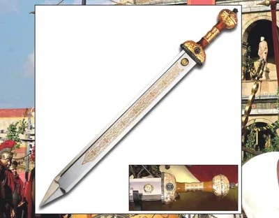 En magnifik reproduktion av Julius Caesars kortsvärd, bladetär fint etsat och format efter den distinkta breda spetsiga Gladiator stilen. Svärdet är autentiskt till storlek och vikt.