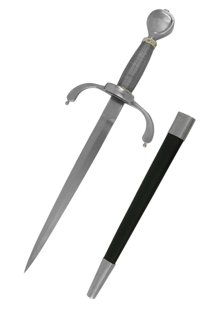 Bladet på denna dolk är smidd av kolstål och levereras med en vacker läderslida. Handtaget är tillverkat av rostfritt stål och det vackra tvärskyddet böjt mot bladet ger det nödvändiga skyddet vid användning. Det gör även att dolken kan greppas för vissa tekniker vid strid.