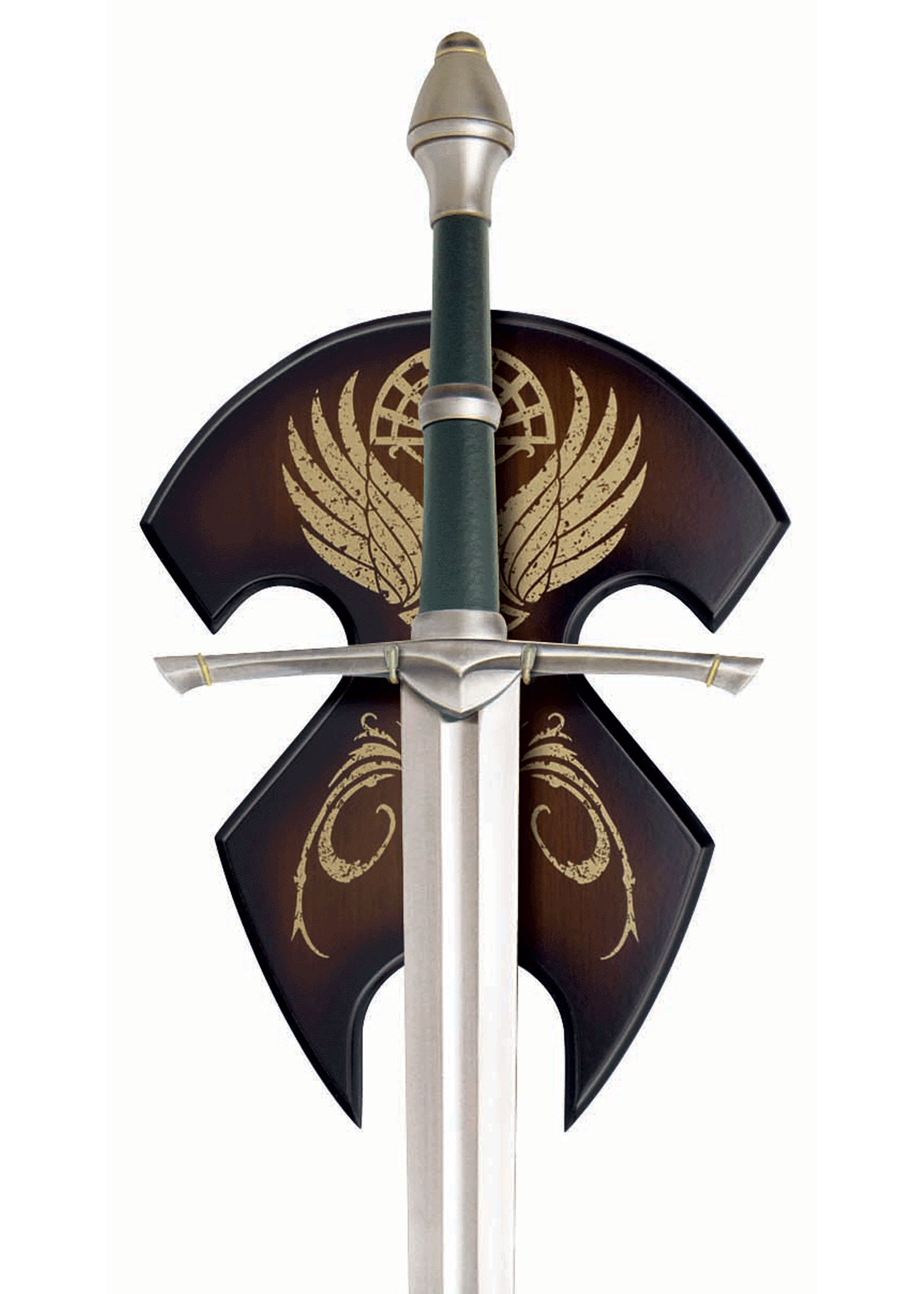 Varje svärd inkluderar en dekorativ skyltplatta i trä som är screentryckt med de heraldiska insignierna från kungariket Gondor. Inkluderar ett äkthetsintyg pergament.